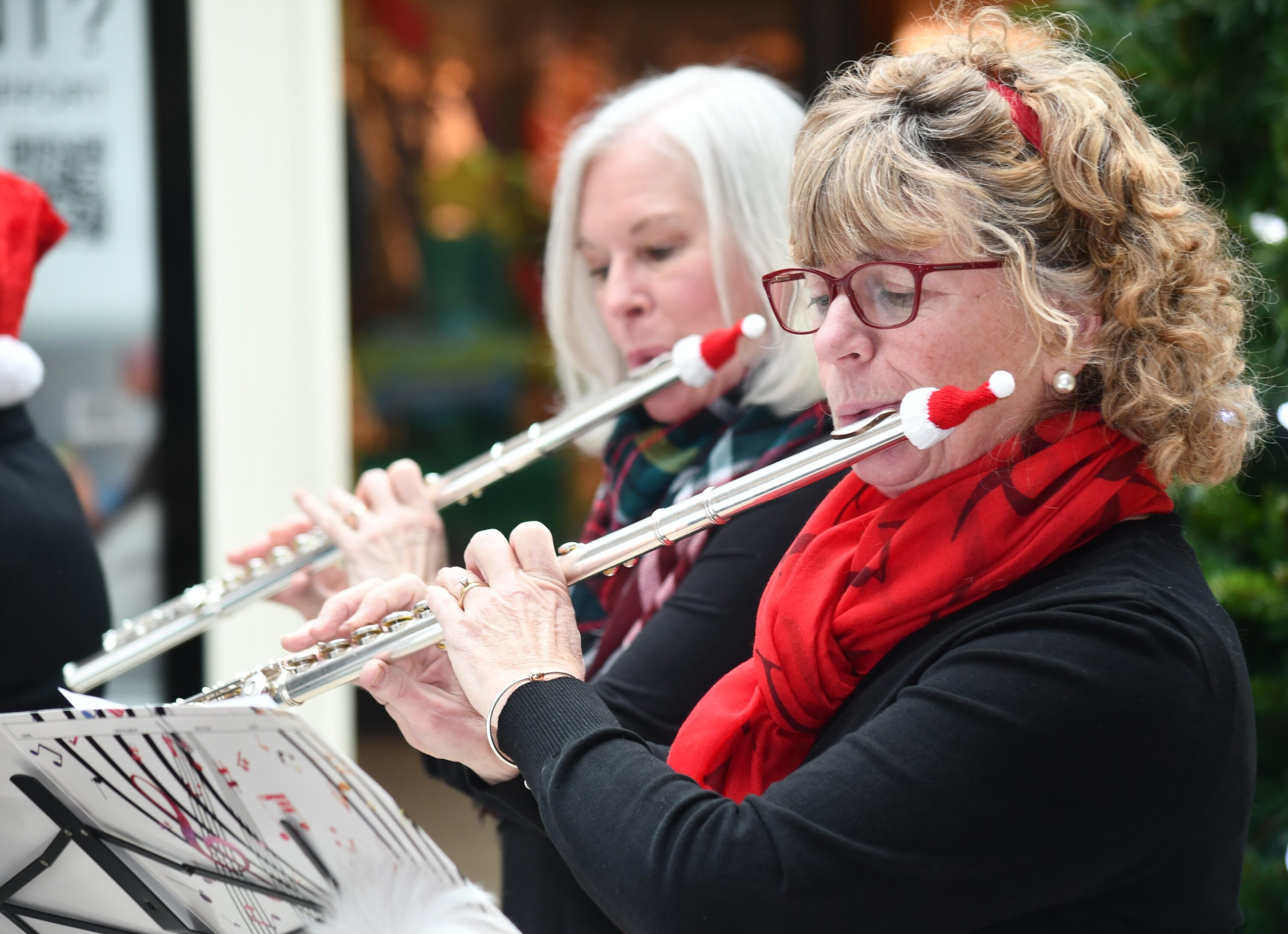 Anne Keefe-Caton (left) and Carol Daigle perform with the Maine Pops Flute Choir during its concert at Maine Mall in South Portland on December 13. (Photo by Steve Barrett.)For 10-member Maine Pops Flute Choir, it was a perfect location during one of the busiest shopping days of the holiday season to hold a shopping center concert.