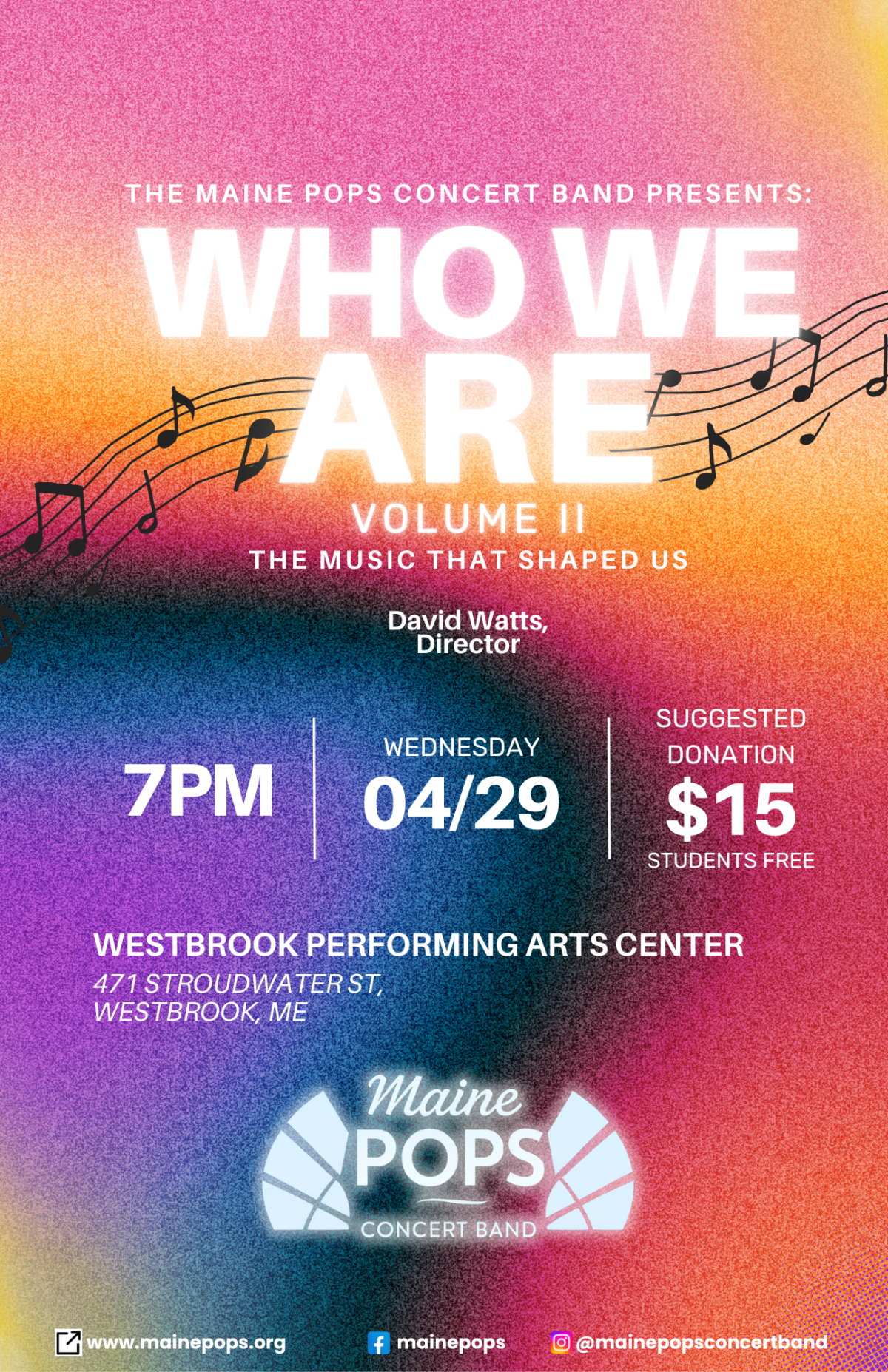 The Maine POPS Concert Band will perform its 2025 spring concert on Wednesday, April 29 at 7 p.m. at the Westbrook Performing Arts Center located at 471 Stroudwater Street in Westbrook, ME. The suggested donation to attend is $15 per person, with students granted free admission.